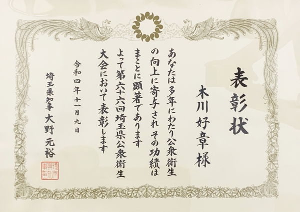 当院の木川好章院長が公衆衛生事業功労者として、埼玉県知事より表彰されました。