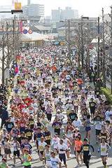 ゼッケンナンバーに従ってスタートラインに並びます。スタート時間の11時50分になっても特に号砲も聞こえず、列も動きません。今年のスターター(スタートのピストルを鳴らす人)は北京オリンピック男子400mリレー銅メダルのアンカー朝原宣治さんですが、なんの音沙汰もありません。