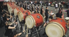スタートから3Kmを過ぎて、上り坂になってくると暑くなってきました。上に着ていた長袖を脱いで腰に巻きます。饅頭屋へそまんじゅう本舗の前では和太鼓で応援してくれました。左の梨状筋、中臀筋のあたりを気にしながら、痛みのない範囲のスピードに抑えて走ります。