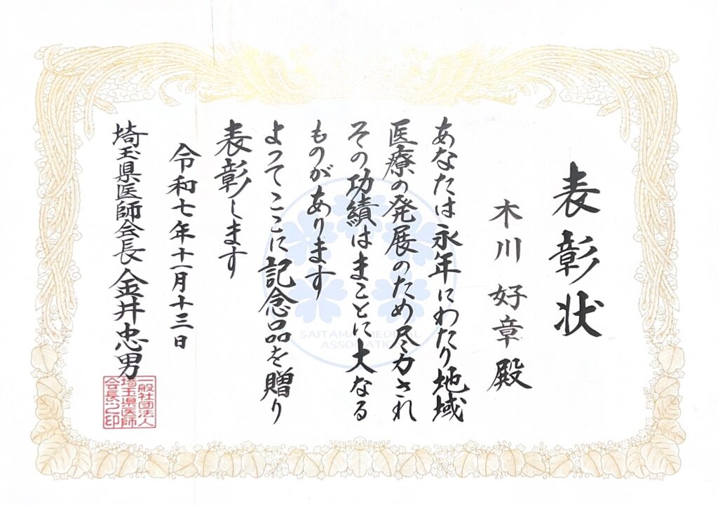 このたび、当院院長の木川好章が、埼玉県医師会長表彰を受賞いたしました。