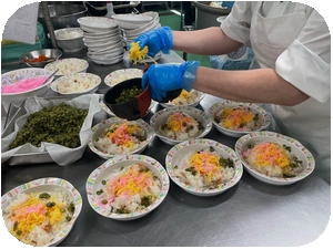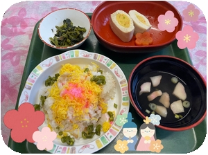 さて、本日の昼食はひなまつりのお祝いでちらしずしを