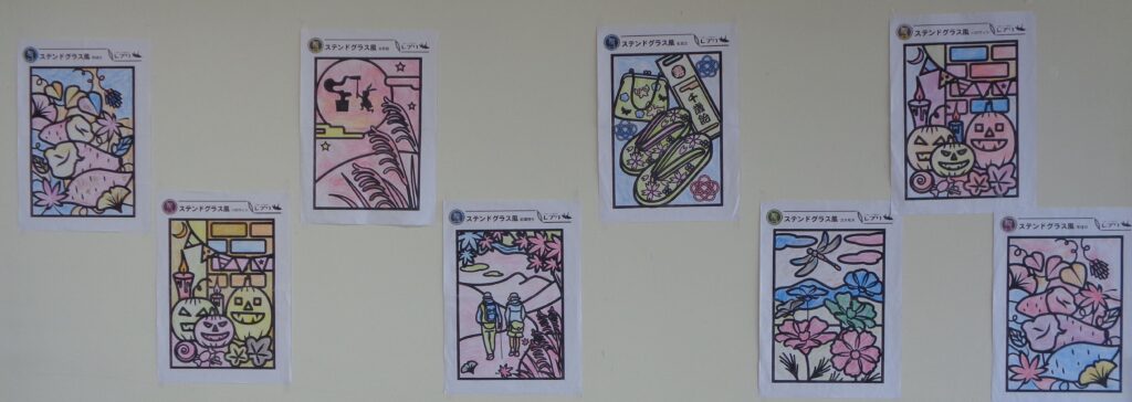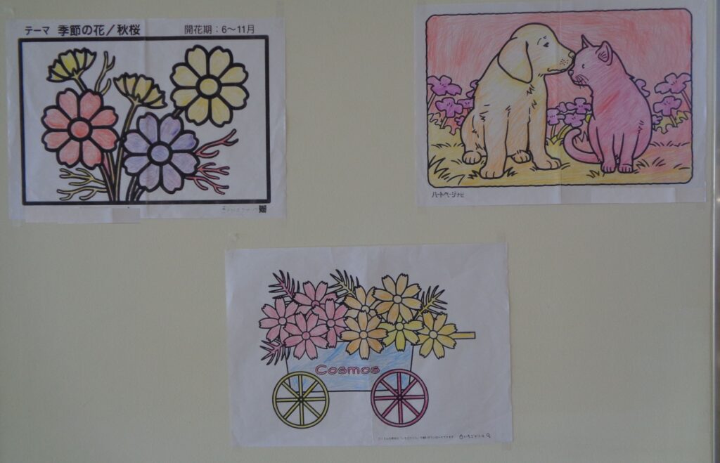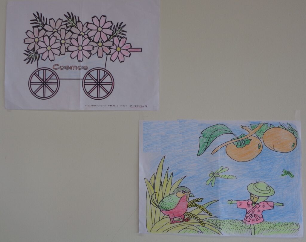 デイルームの壁には秋らしい塗り絵作品も多数飾っています。