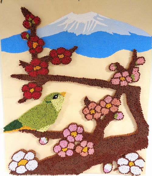 背景の富士山は、貼り絵で行われています。